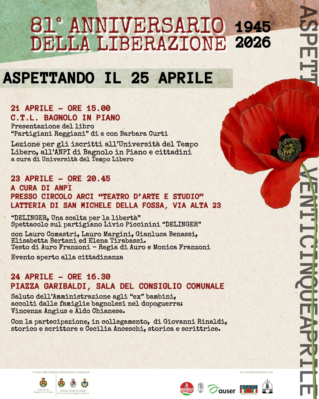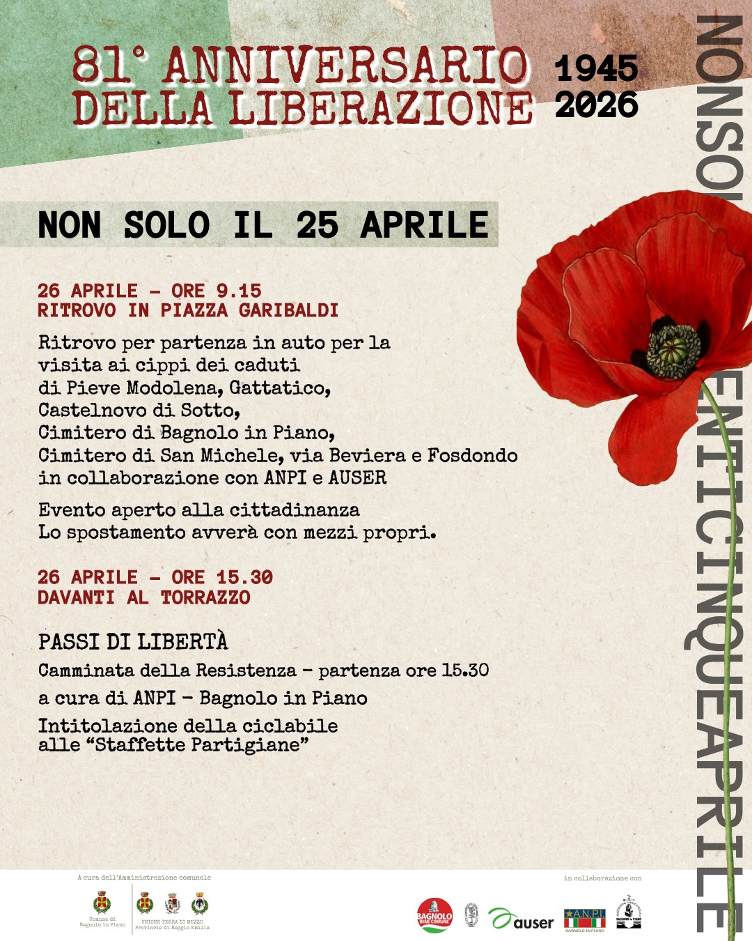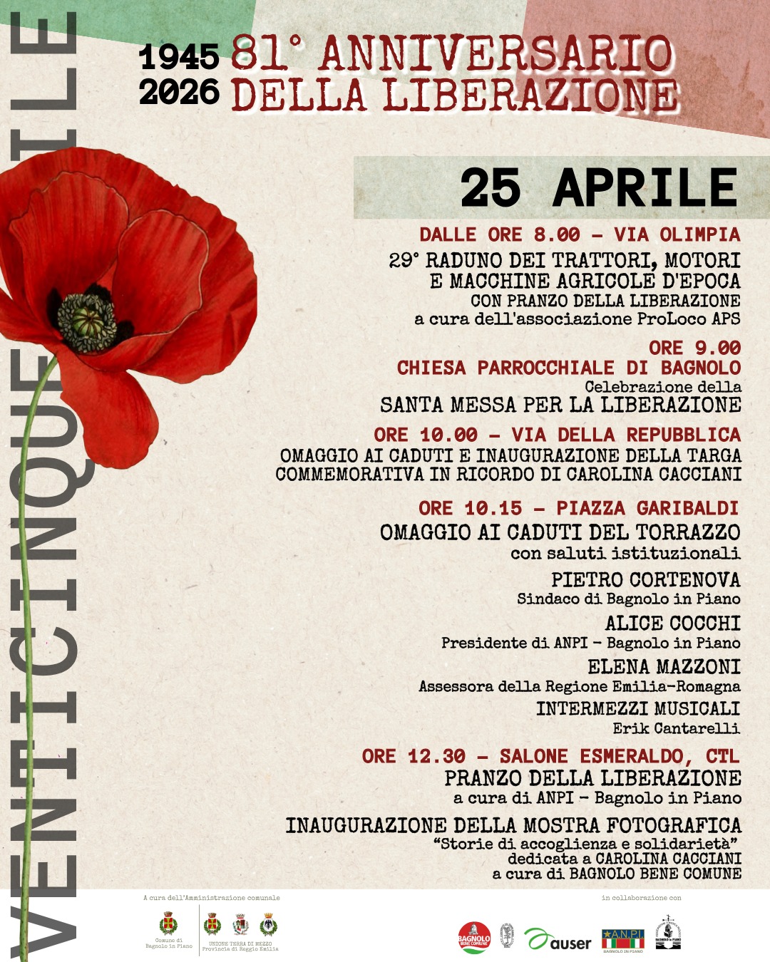 Le iniziative, come è consuetudine, sono realizzate grazie a una collaborazione ampia e partecipata che coinvolge, accanto all’Amministrazione comunale, ANPI – sezione di Bagnolo in Piano, AUSER, la Pro Loco APS, a conferma di un impegno condiviso nella custodia della memoria e nella promozione dei valori civili.